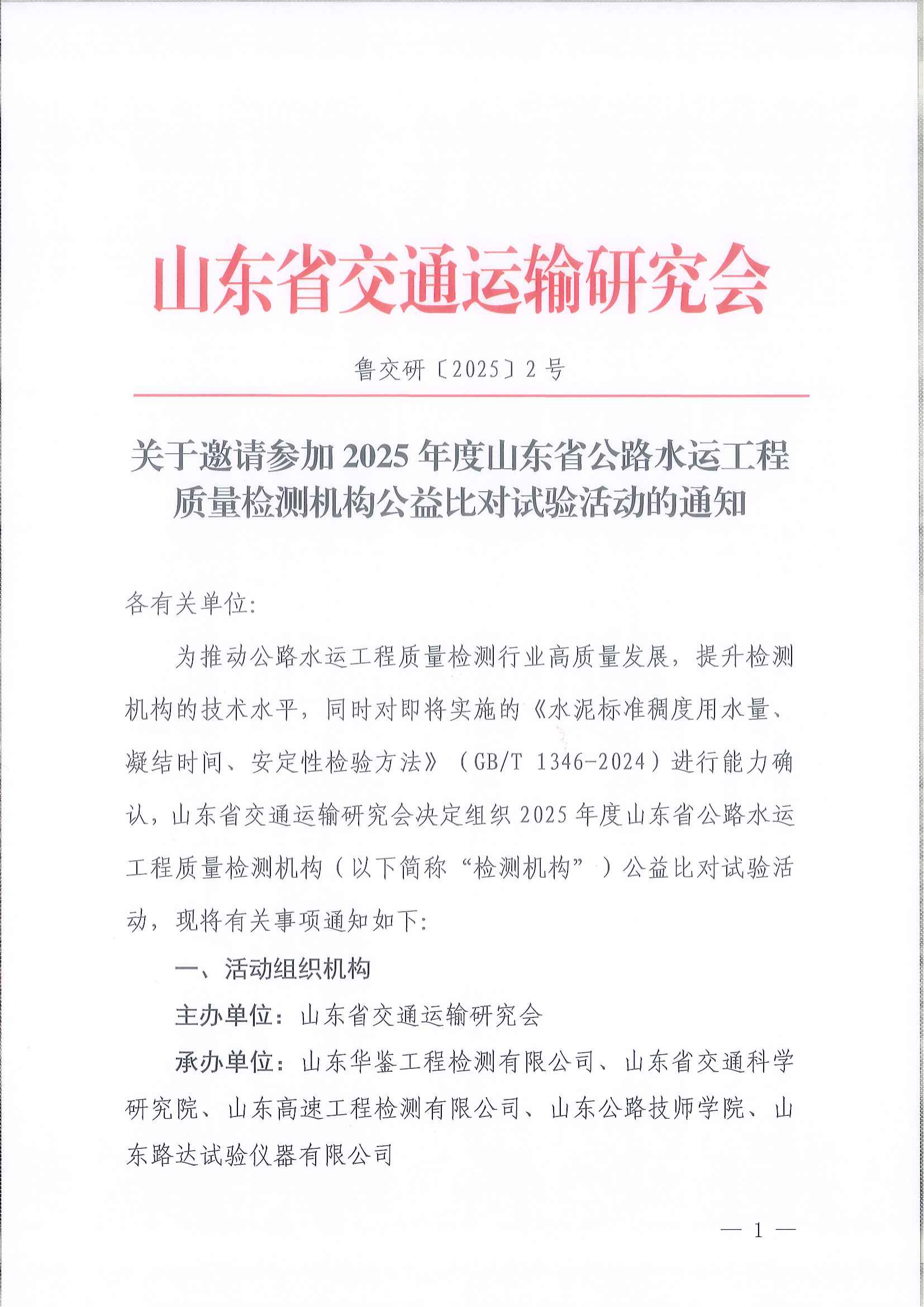 關(guān)于邀請(qǐng)參加2025年度山東省公路水運(yùn)工程質(zhì)量檢測(cè)機(jī)構(gòu)公益比對(duì)試驗(yàn)活動(dòng)的通知